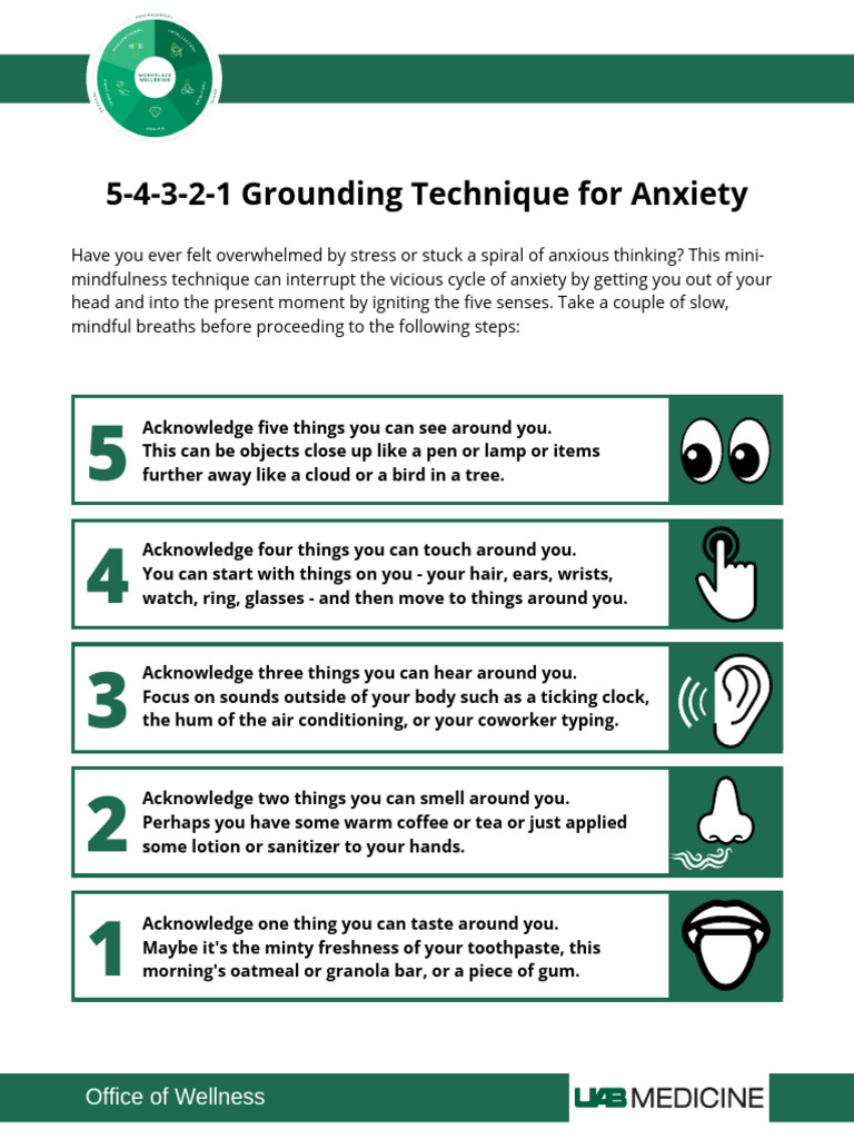 Write them down here with your parent: A calming technique that connects you with the present by exploring the. Grounding techniques help control these symptoms by turning attention away from thoughts, memories, or worries, and refocusing on the present moment. Pay attention to things around you using all five of your senses. Then follow the pictures left to right.