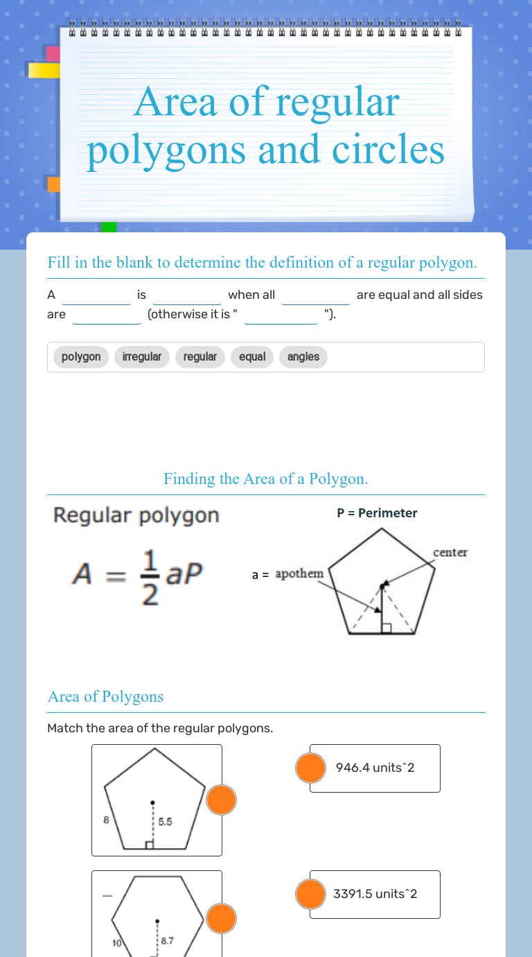 Find the area of each regular polygon. Area — 12 —x ( apothem x perimeter ) 2. The area of irregular polygons can be found out by dividing them into triangles and rectangles. Area of regular polygons worksheet math monks find the area of the given regular polygons.