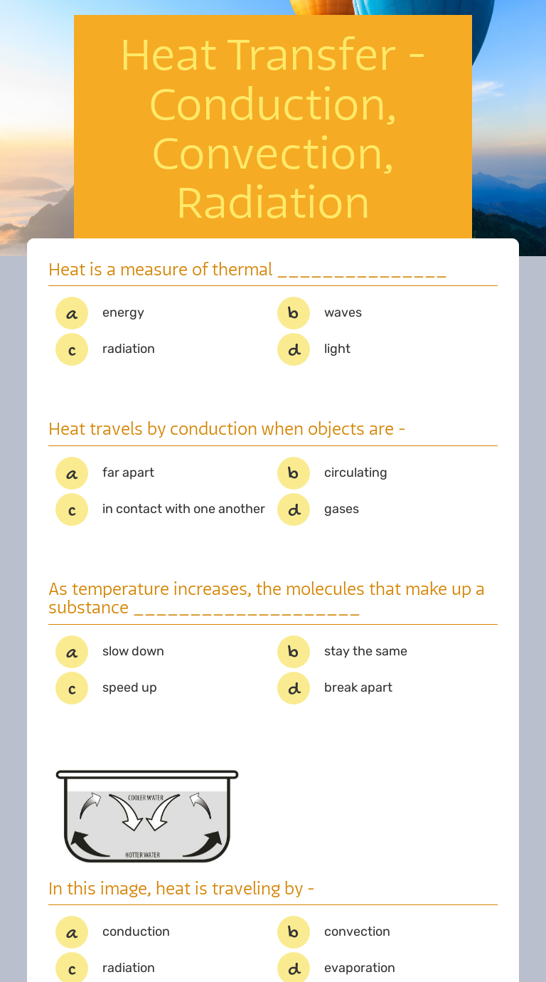 These worksheets, aligned with the heat chapter, focus on the production, transfer, and measurement of heat. Conduction, convection and radiation in each of the following examples, identify whether heat is being transferred.