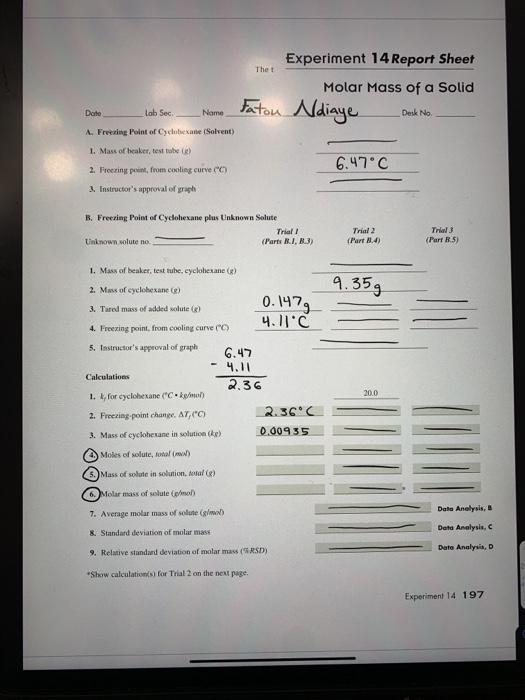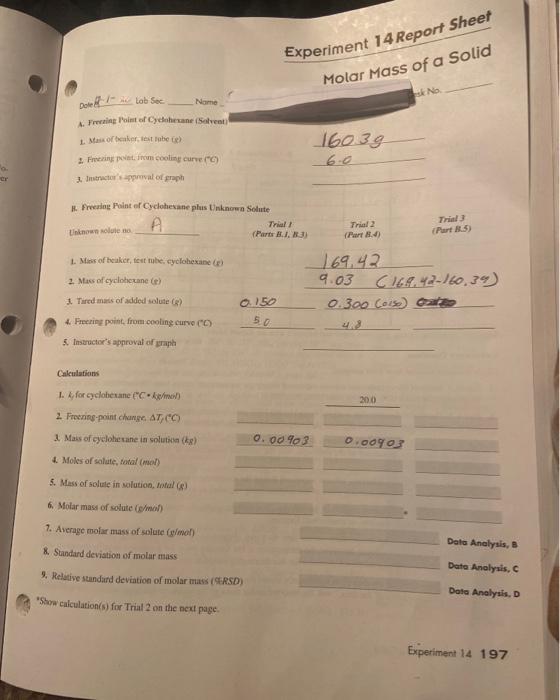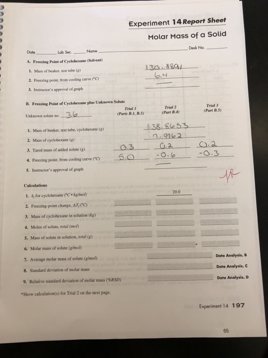 Solved Experiment 14 Report Sheet Molar Mass of a Solid Lab