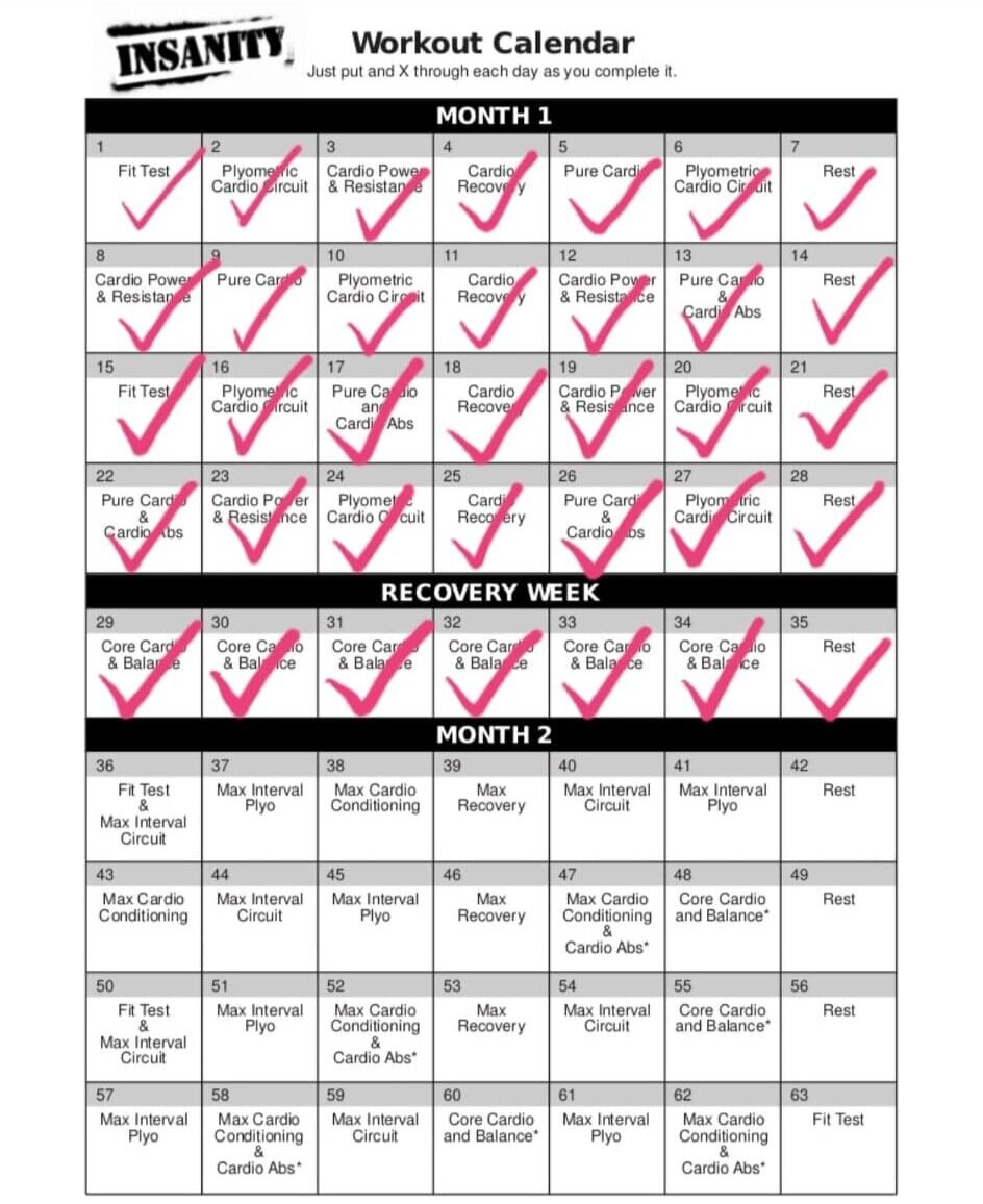 Insanity calendar schedule created date: * if you have the deluxe package, you can replace cardio abs. Check a box every day you do your insanity® workout.