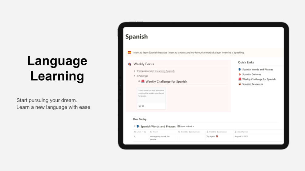 Language Learning Notion Template - You can learn through sentence or word memorization, and it's easy to use. Substitute your notebook in a tidier way, and also make flashcards for what you have learned. Perfect for personal language education. Includes 52 weekly challenges to help users advance in their target language. Web 30+ best notion language learning templates for study & progress tracking ⭐ life os: Web notion language study template. Web language learning template i was playing with the idea of learning languages by knowing the history behind how they came to be and how the writing systems were developed. Web here are the 11 best free notion templates i’ve found for learning a language. The best free notion language learning templates; Basically i add all words that i am learning into this database.