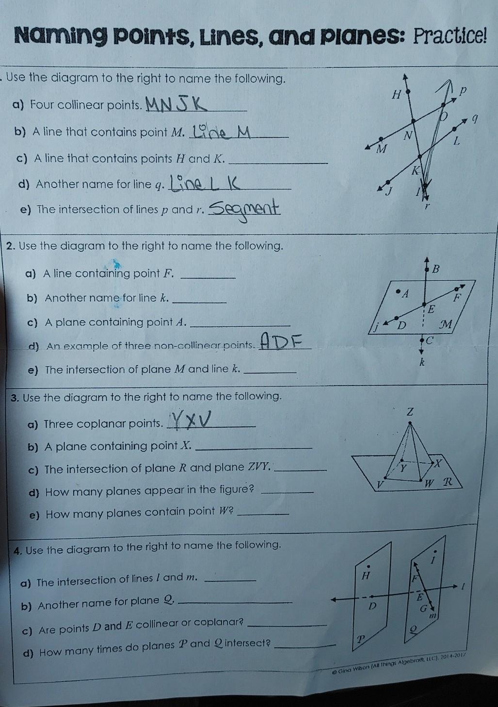 This ensemble of printable worksheets for grade 8 and high school contains exercises to identify and draw the points, lines and planes. Name a ray by its endpoint and another point on the ray. Name a line that contains point d. Three points that are all on a line. Give 5 different names for this line.