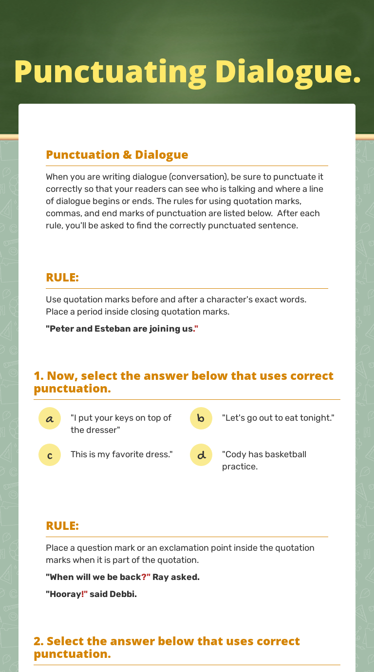 Teaching dialogue—how to use it effectively and how to punctuate it. (two sentences contain no errors) 1. Practice punctuating dialogue with commas and quotation marks in these grade 4 worksheets. Punctuating dialogue when you write dialogue, or use direct quotations, put quotation marks. These worksheets provide additional practice in punctuating dialogue. To nurture this skill and help students grasp the nuances of dialogue punctuation, educators.