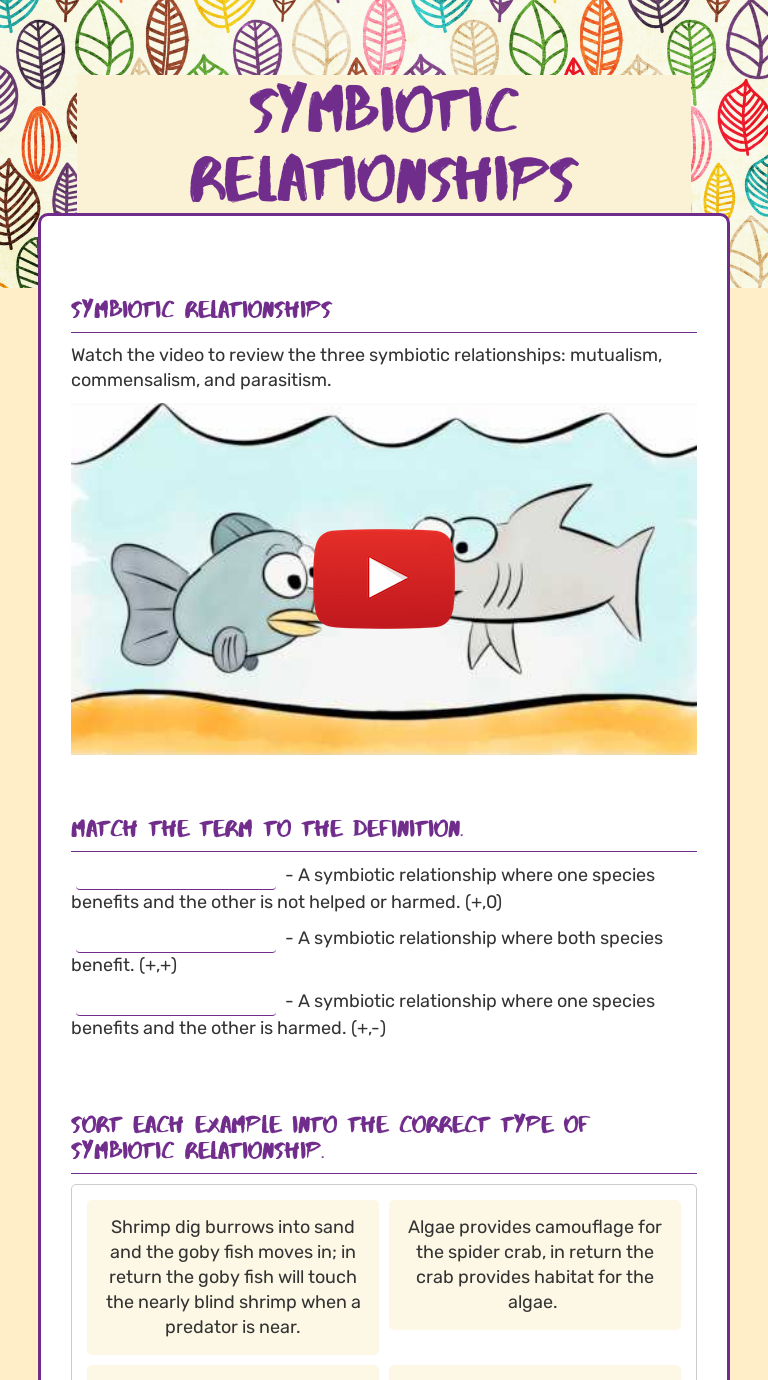 You can access the answer key, a word document (printable & editable), and google slides link of this content from the following resource: •they will answer questions, identifying the type of symbiotic relationship. •students will learn the definition of symbiosis. •they will explore the 3 types of symbiotic relationships and examples of each. Tapeworms are segmented flatworms that attach themselves.