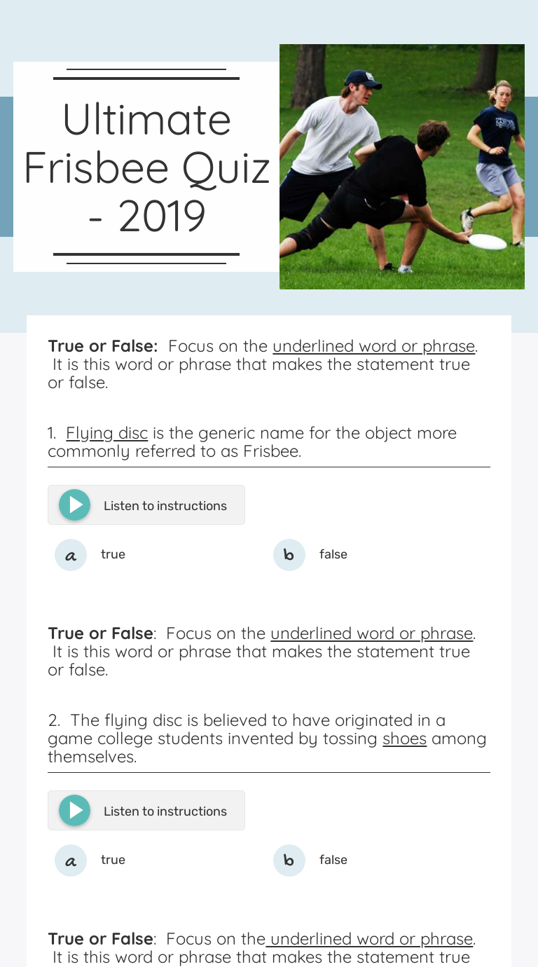 Ultimate Frisbee Quiz 2019 Interactive Worksheet by Teresa Collier