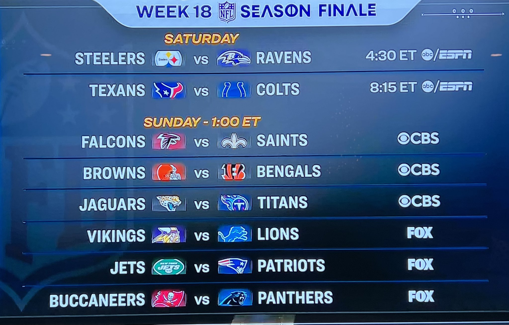 Specific dates, start times, and networks for week 18 matchups will be determined and announced. Space to write in game.