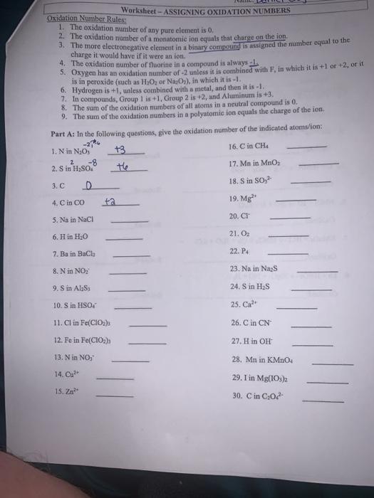 Solved Worksheet ASSIGNING OXIDATION NUMBERS Oxidation